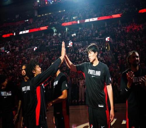 北京时间2025年10月23日,开拓者队球员杨瀚森(前右)与队友夏普(前左)在赛前击掌。当日,在2025-2026赛季NBA常规赛中,波特兰开拓者队主场114比118不敌明尼苏达森林狼队。开拓者队中国球员杨瀚森替补出战,迎来自己的NBA常规赛首秀。 新华社/美联