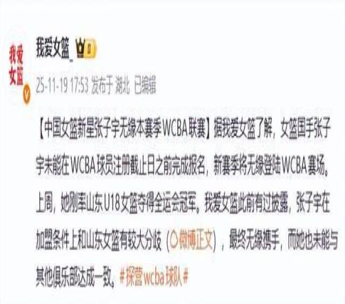 之前有消息说,山东高速女篮正在和张子宇谈判,希望她能加入山东高速女篮,新赛季开始代表山东出战WCBA。可惜的是,根据我爱女篮的报道,张子宇与山东高速女篮的谈判未能达成一致,以至于张子宇错过了11月18日的球员注册日,使得张子宇将会无缘新赛季的WCBA联赛。