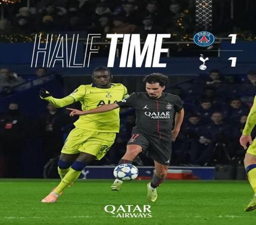 上半场比赛结束,我们暂时和热刺战成1-1。