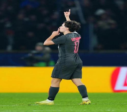 第45分钟,维蒂尼亚弧顶迎球抽射扳平比分!1-1!