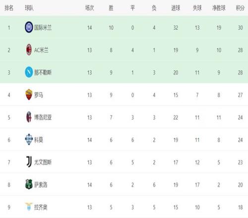 在积分榜上,国际米兰暂时登上榜首位置。国际米兰10胜4负,拿到30个积分。而AC米兰和那不勒斯都是28分,排名第2和第3名。不过,AC米兰和那不勒斯比国际米兰少踢1轮。罗马以27分排名第4。第5的是博洛尼亚,拿到24分。输球的科莫也是24分,排名第6。尤文图斯以23分排名第7。萨索洛20分排名第8。拉齐奥只拿到18分,排名第9。